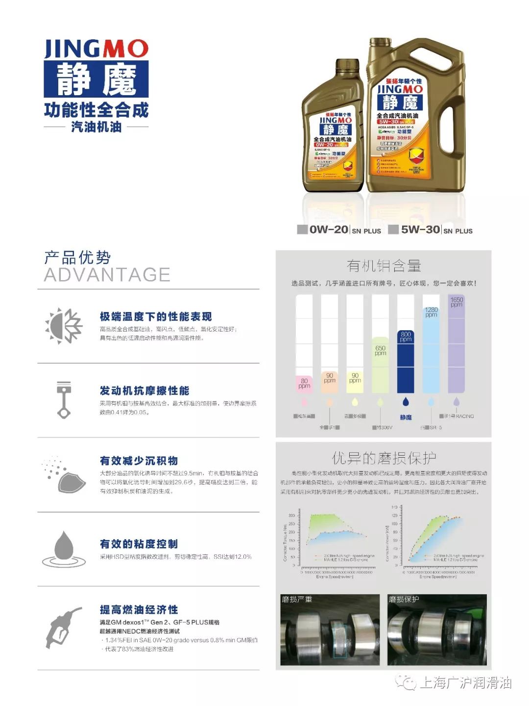 靜魔是互匯(上海)潤滑油有限公司推出的一款高端功能性產品,選用先進的全合成基礎油,在知名潤滑油企業經典配方的基礎上,添加由1998年在清華大學摩擦學國家重點實驗室博士后流動站出站的姚俊兵博士經二十多年研發的有機鉬經典復合比例配方。能有效減少高達99.8%金屬磨損,有效減少高達58.2%的磨斑直徑;可以成倍延長機油的抗氧化性能,保證潤滑油性能長期處于優良狀態。